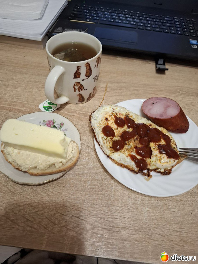 Яичница из 2-х яиц, кетчуп, колбаса балыковая, чай ромашковый, бутер с Санта Бремор и адыгейским сыром