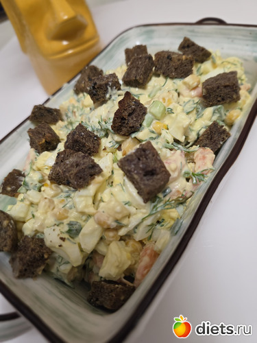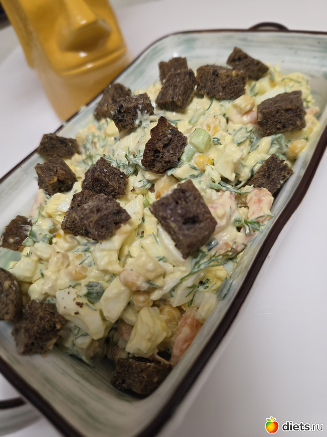 В салатнике соединяем креветки, яйца, кукурузу и зелень. Заправляем домашним майонезом, аккуратно перемешиваем. Перед самой подачей добавляем сухарики из кето-хлеба, чтобы они остались хрустящими!