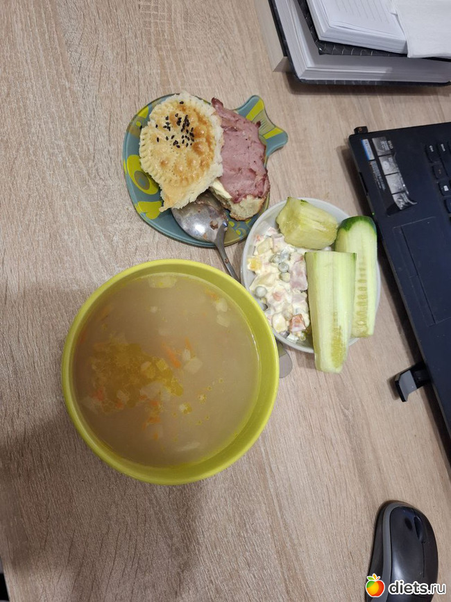 Ну хоть ужин классический доедалкин - гороховый супчик на говядине, оливье, чищенные огурцы, лепёшка с маслом и паштетом (не съеденная Петей утром)