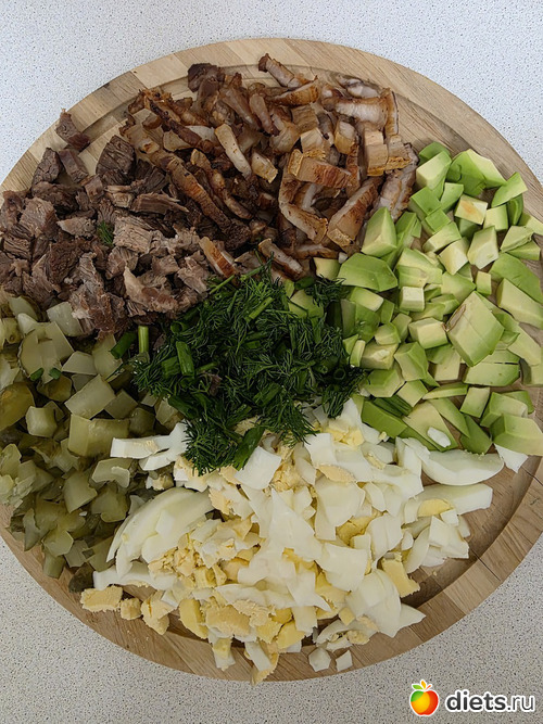 · В просторной миске соедините все нарезанные ингредиенты: говядину, подчеревок, авокадо, яйца, огурцы, лук и укроп.