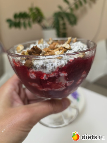 2. Сборка: В красивый стакан или пирожковое блюдце выложите слоями чиа-пудинг, ягодный джем, снова пудинг. Сверху украсьте орехами и ягодами.