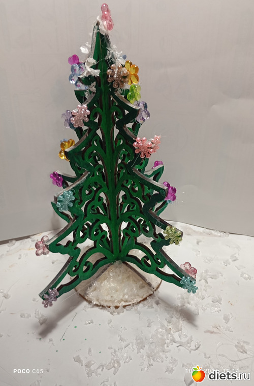 С удовольствием окрасила и украсила фанерную ёлку, в понедельник принесу на работу, на стол поставлю. И будет у меня новогоднее настроение. Нравится мне как ёлка получилась.