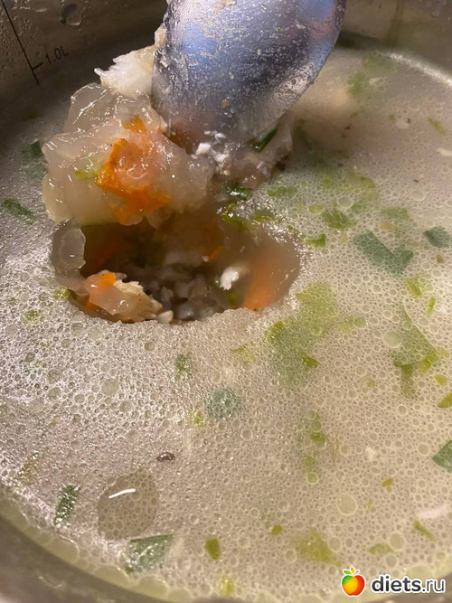 Это вчерашний супчик из групера. У него толстенная шкура, поэтому бульон получается насыщенный.