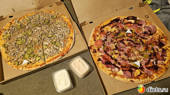 2 пиццы по 60 см, даже не поместились на наш стол ))), для троих мальчиков