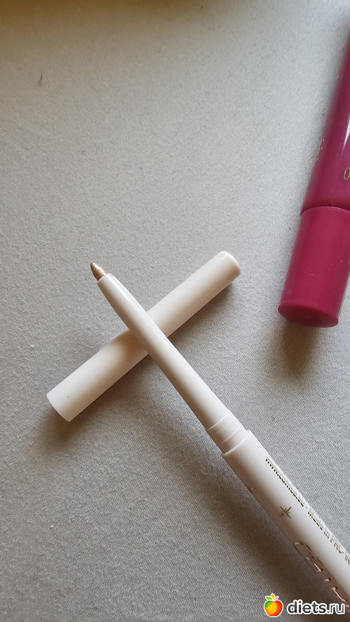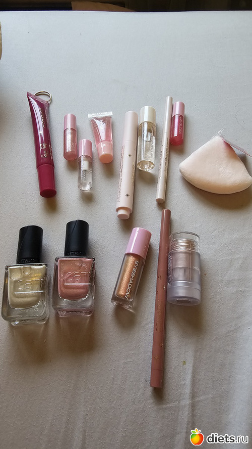 Верхнее - дочке (тинт для губ, 2 цветных блеска и один прозрачный, масло для губ, помада, гель для бровей, карандаш золотого цвета, спонж)