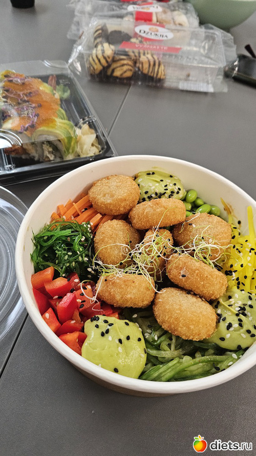И праздничный обед. Еще днем раньше коллеги мне прислали ссылку, по которой надо было выбрать блюдо. Но в той точке были только суши и боулы. Ни то, ни другое не люблю. Выбрала боул с камамбером. Сам камамбер ок, а остальное