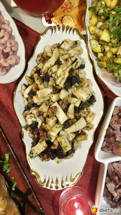 Для салата с кальмарами нужно: уже отвареные кальмары, обжареный грецкий орех, чернослив, укроп, бальзамик, соль, перец, оливковое масло. Мне в целом очень понравилось, но муж переборщил с маслом