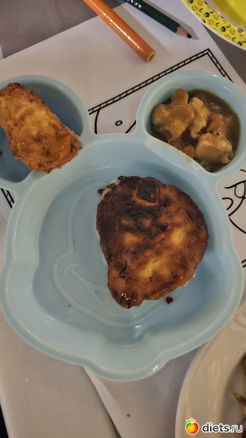Пример детских блюд из специального стенда: рыба в тесте, блины и гуляш из курфиле