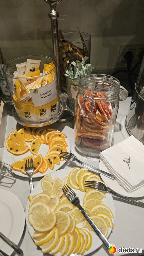 Любителям чая есть, где разойтись. Три вида меда, цукаты, лимон, апельсин с гвоздикой и конечно много видов чая. Это большая редкость