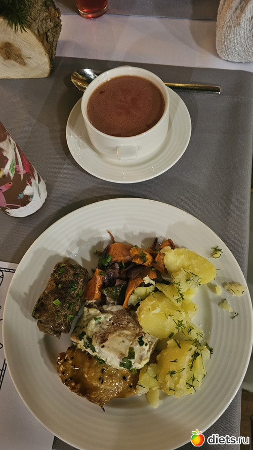 Борщ, курфиле, говядина, свинина, картошка, тушеные овощи с бататом