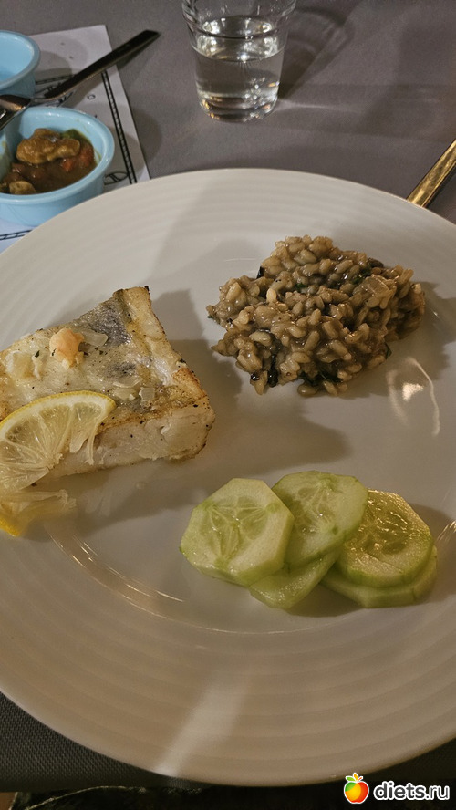 Рыба в винно-креветочном соусе, ризотто с лесными грибами, огурцы