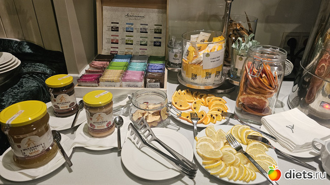Любителям чая есть, где разойтись. Три вида меда, цукаты, лимон, апельсин с гвоздикой и конечно много видов чая. Это большая редкость