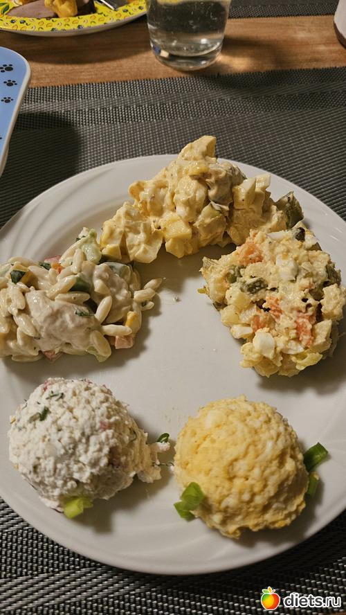 Майонезные салаты, один из них с макаронами орзо, яичная и творожная пасты