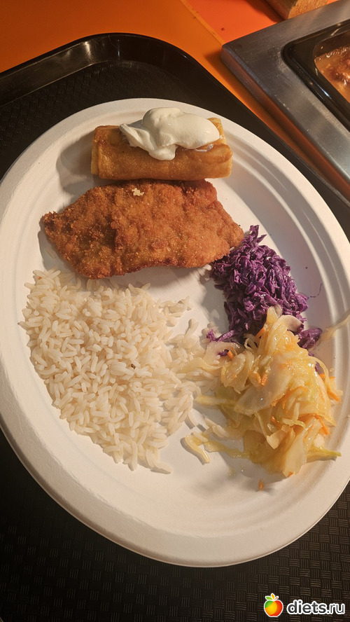 Малышок сам себе выбрал курфиле в панировке, блинчик с творогом, рис и два салата