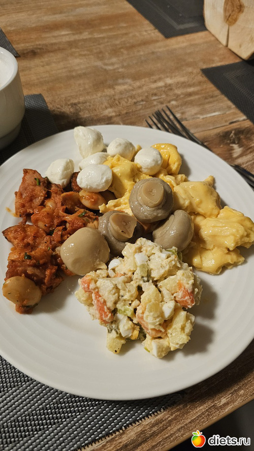 Омлет, оливье, тушеные овощи с сосисками и фасолью, мини моцарелла, маринованые грибы