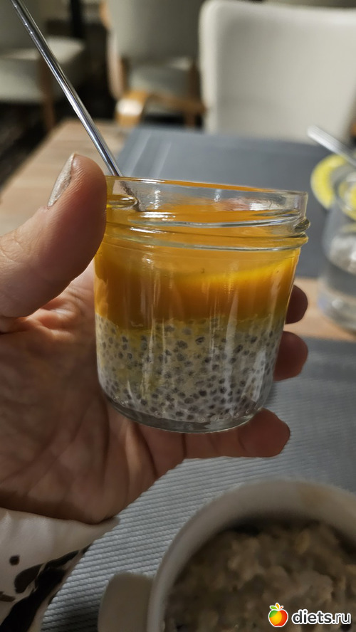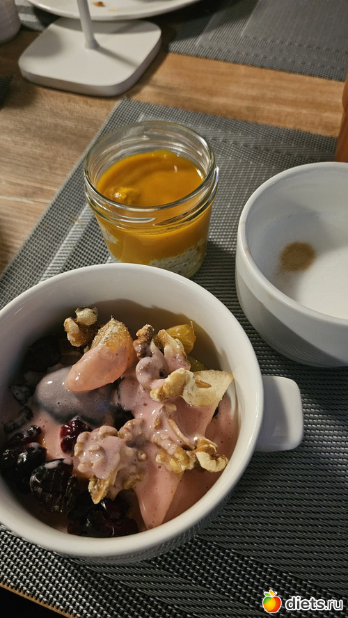 Повторила чиа пудинг - вкуснее даже я не могу приготовить - и йогурт с фруктами, сухофруктами и орехами