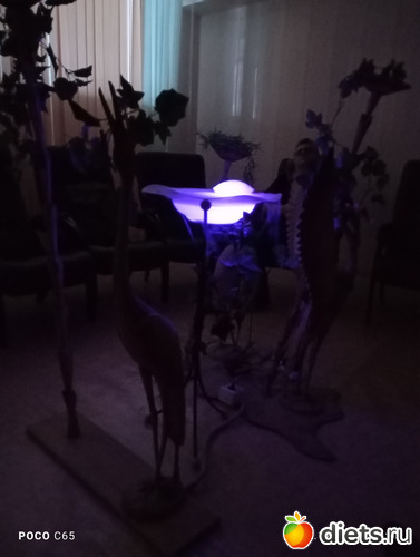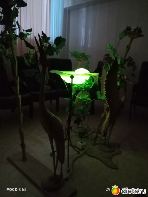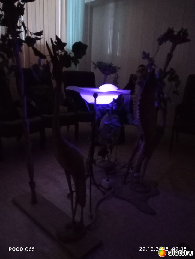 Сегодня у меня был первый сеанс карбокситерапии (уколы с углекислым газом). Вполне терпимо. Много-много укольчиков тонкой иголочкой ( инсулиновой по-моему). По всему позвоночнику, плечи, крестец, ягодицы. В область коленей больновато, вдоль позвоночника нет. Колени сразу лучше ходить стали, даже удивительно. Определились со временем. 2 января надо передвинуть бассейн на пораньше (попрошу сегодня об этом). Фиточай получили, На аромотерапии расслабились. Аромотерапия выглядит вот так: кресла вокруг деревянных фигур журавлей и подсвеченного фонтанчика, полумрак и релакс-музыка