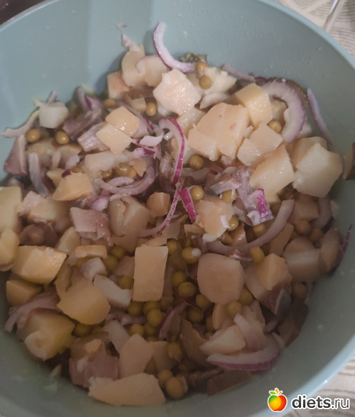 Салатик картошка, селёдка, горошек, лук зелёный, масло растительное с запахом и немного уксуса -необычно, но мне там горошек лишним показался