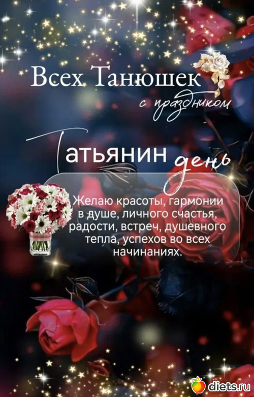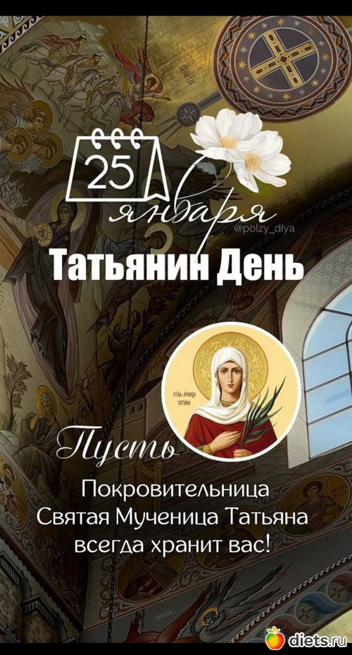 Дорогие Татьяны, с вашим чудесным днем ангела! Пусть святая покровительница, чье имя вы носите, оберегает вас своей благодатью, дарит крепость духа, мудрость и внутреннюю силу, что помогает преодолевать любые трудности.