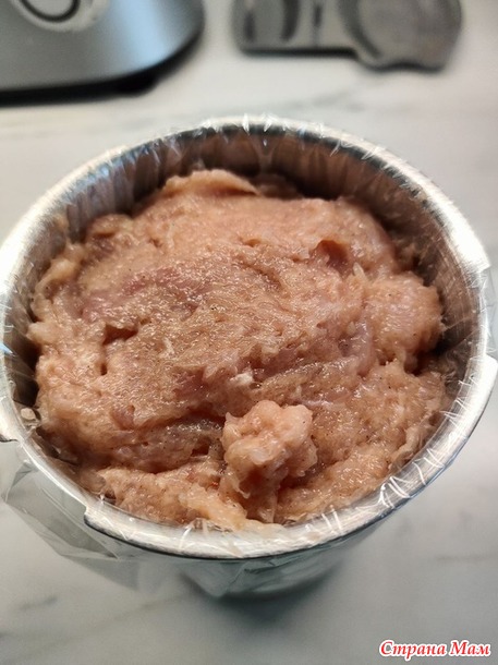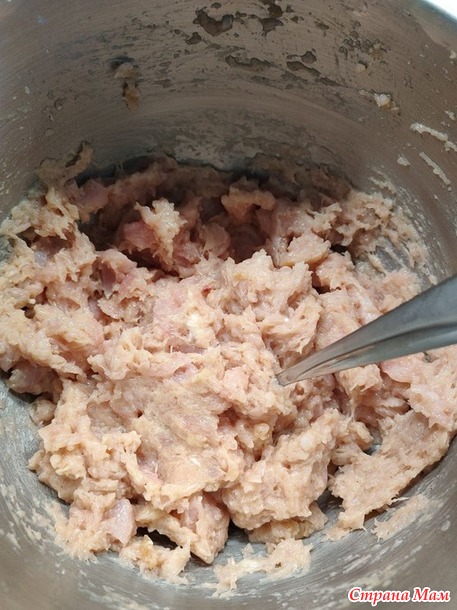 Далее, пропускаю 20-30% мясной массы через мясорубку. Складываю все мясо (и кусочки, и пропущенное) в чашу миксера, добавляю специи и ледяную воду.