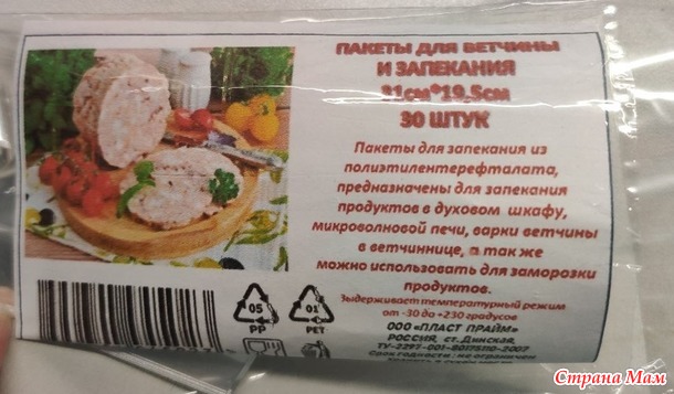 Предварительно ветчинницу выстилаю специальным пакетом. Это может быть обычный рукав для запекания, но он широкий, поэтому я купила такие пакеты: