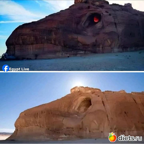 Но реальность (нижнее фото) не менее поэтична. Пустая глазница дракона — это глубокий грот. В определенные часы, когда солнце опускается к горизонту, лучи пронзают пещеру насквозь, создавая мягкое, мистическое свечение. В этот момент кажется, что древний ящер вот-вот вздохнет и стряхнет с себя вековую пыль.