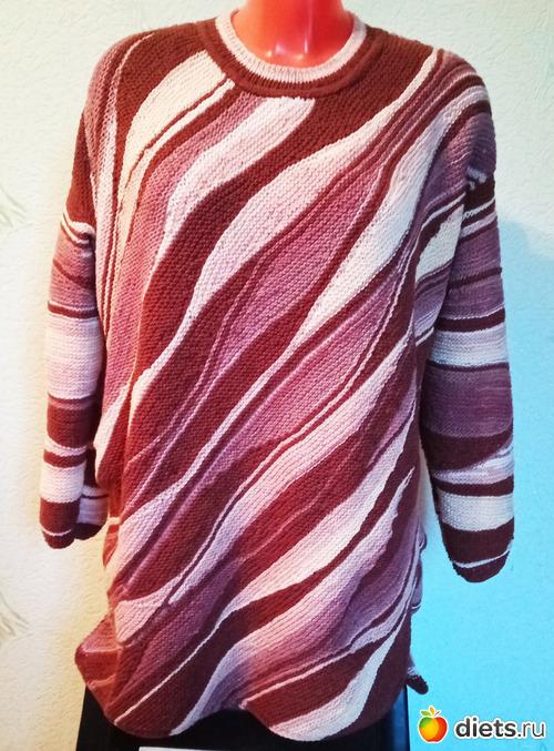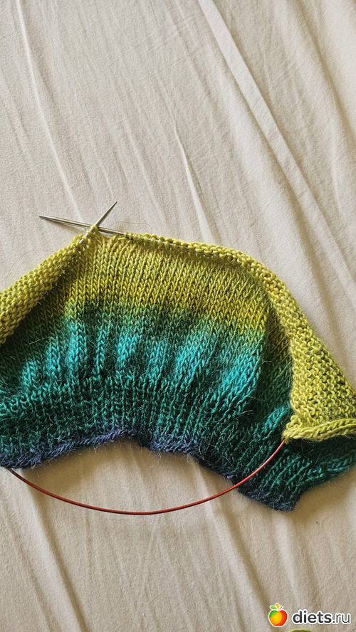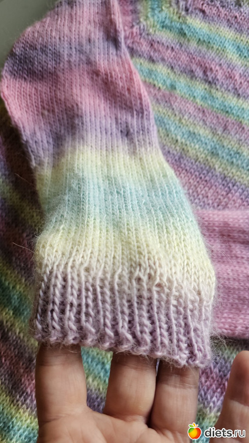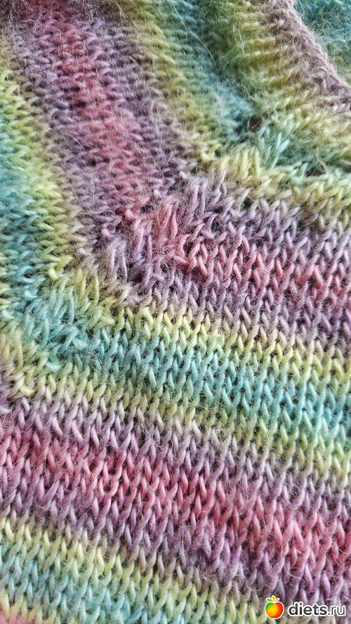 Мне не нравится, как пряжа раскладывается в обычные, стандартные для турецкой пряжи, полоски. Я ж с дуру и себе такую пряжу купила, только в другом цвете. Обмозговала, как вязать, что бы избежать полосок, и пришло в голову попробовать перед (и спинку соотв) вязать двумя отдельными деталями, так секции будут более длинными и размытыми, как в свитере дочки на рукавах. И начать с разных цветов, что бы они не совпали в полоски. На самом деле даже думала из трех деталей делать, но кое-кто ведь не заморачивается с рассчетами, поэтому, отвязав приличный кусок первой детали, понимаю, что их будет достаточно двух