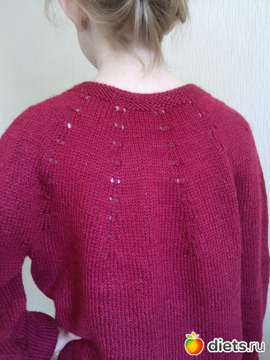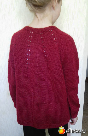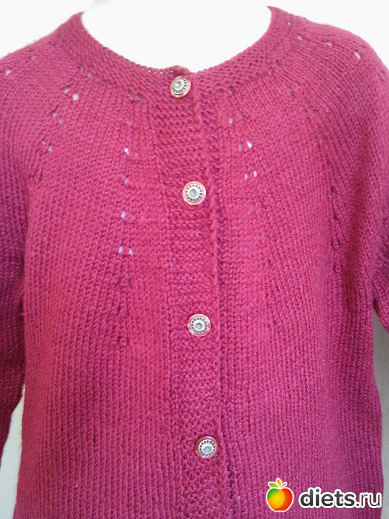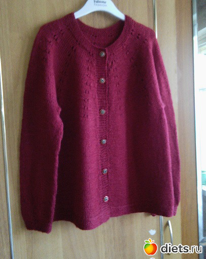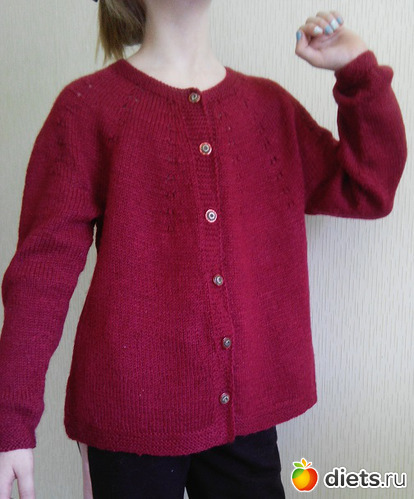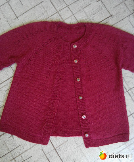 Кофточку вязала сверху вниз спицами номер 3. Обычная лицевая гладь, прибавки по кругу. На ютюбе был мастер-класс по такой кокетке. К большому сожалению, сейчас не помню даже автора. Спасибо ему, вернее ей.