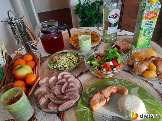 Столько всего наготовила: печёночный тортик, салатики, два горячих, сёмга с рисом и курица с картофелем (я съела только первое блюдо), какой-то чудодейственный морс, с вишней и мятой, не варился, а настаивался по какой-то особой технологии в особой посуде. нарезка, как в ресторане. Пили мартини.