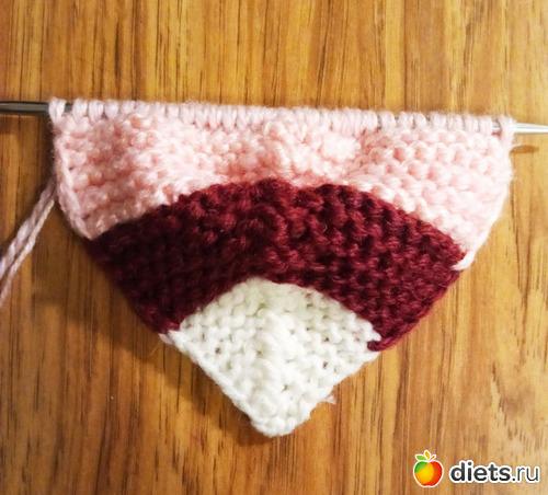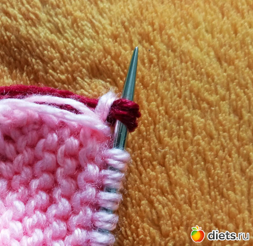 Заканчиваем вторым цветом, провязав один ряд лицевыми и один ряд изнаночными.