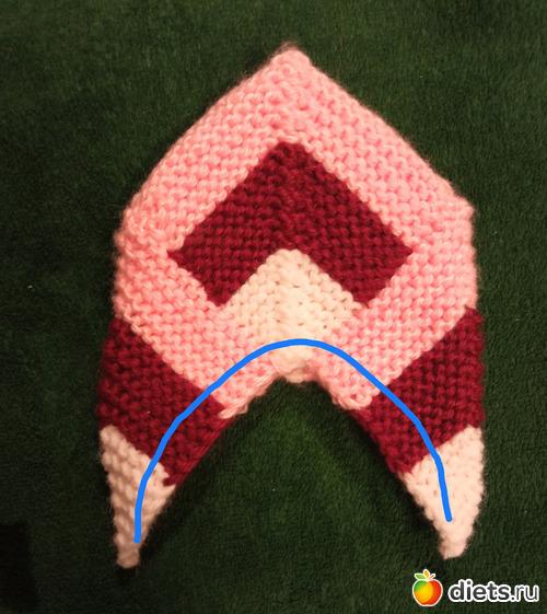 Поэтому, начиная от стыка справа набираем 13 петель, провязываем 2 петли со спицы, центральную петлю, 2 петли со спицы и набираем еще 13 петель.