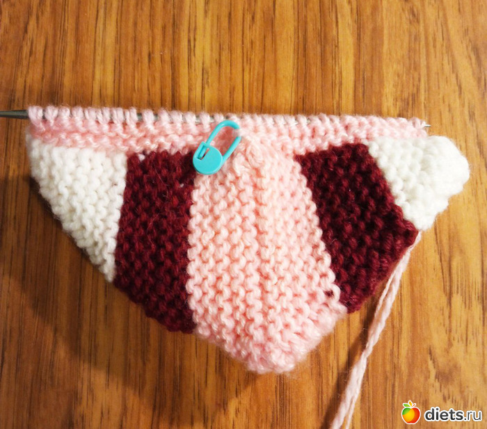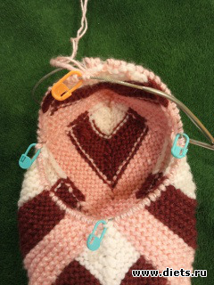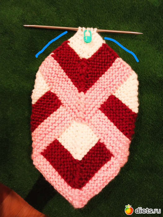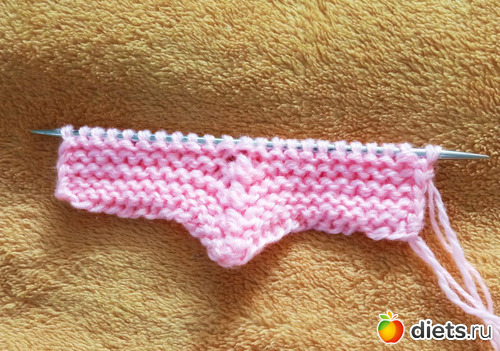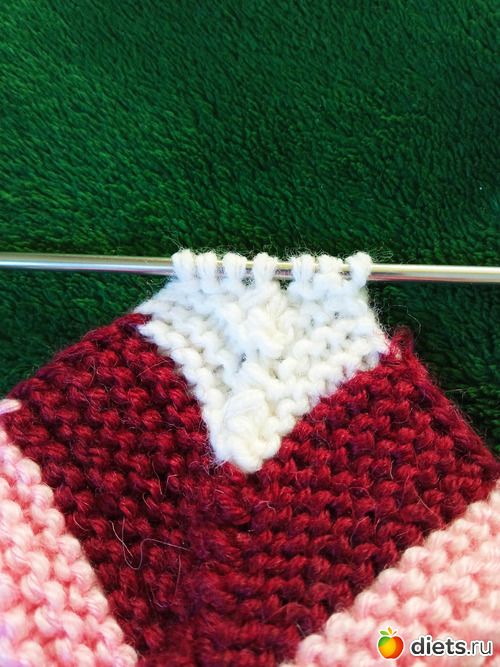 Поэтому, начиная от стыка справа набираем 13 петель, провязываем 2 петли со спицы, центральную петлю, 2 петли со спицы и набираем еще 13 петель.
