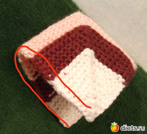 Теперь вяжем боковую часть тапочка, для чего набираем 15 петель по боковому краю одного квадратика, одну петлю из уголка на стыке квадратиков и 15 петель по боковому краю второго квадратика. В этот момент радуемся, что мы молодцы, потому что связали по краю косичку, из которой удобно набрать петли )))