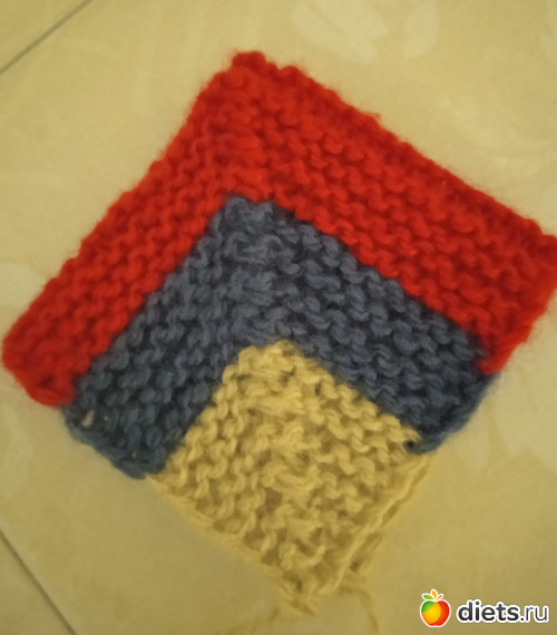 У меня пряжа толще, ноунейм, вяжу на проблемные ножки, вяжу не 4, а 5 изнаночных рубчиков каждого цвета и квадратик мой побольше