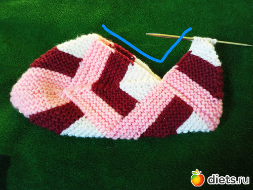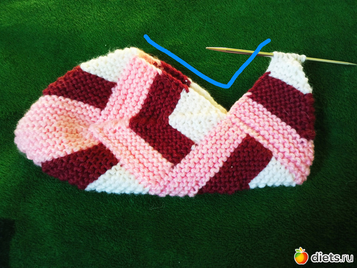 И снова вяжем квадратик. Это продолжение подошвы. НО вяжем не до конца, а до того момента, когда на спице останется 5 петель.
