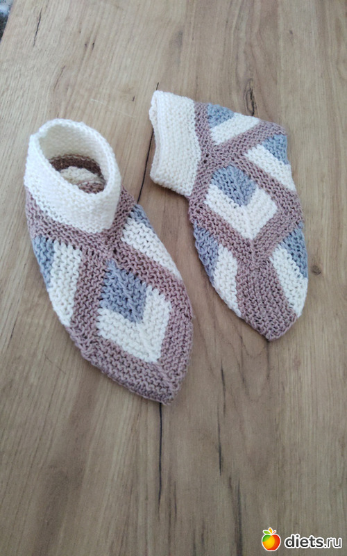 Тапочки состоят из 6 квадратов, связанных платочной вязкой, и соединяемых друг с другом в процессе вязания.