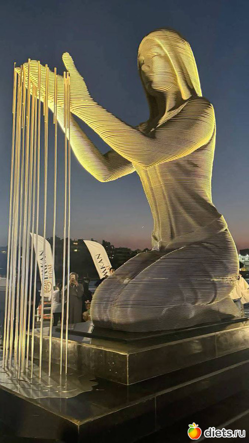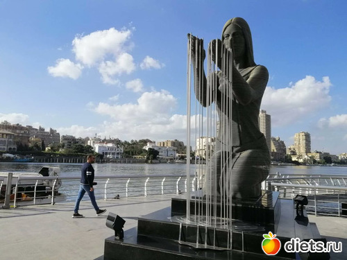 В каждой линии чувствуется эхо Древнего Египта, но в абсолютно современном, «цифровом» прочтении. Вечером, под лучами подсветки, статуя кажется почти прозрачной, растворяясь в сумерках над Нилом.