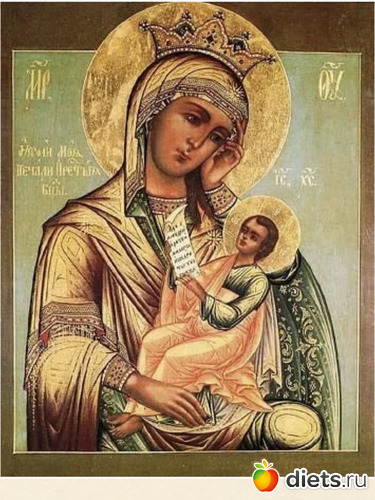 Утоли болезни/ многовоздыхающия души моея,/ утолившая всяку слезу от лица земли,/ Ты бо человеком болезни отгониши/ и грешных скорби разрушаеши,/ Тебе бо вси стяжахом надежду и утверждение,// Пресвятая Мати Дево.