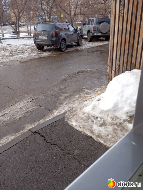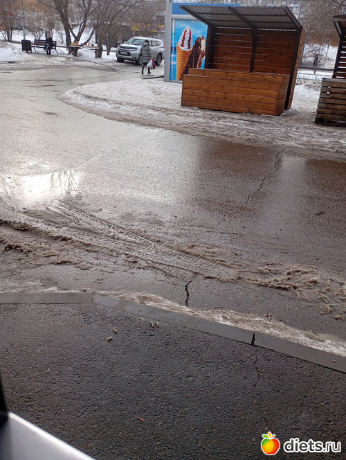 Выхожу из подъезда, а на улице огромная лужа. Хорошо, что я хожу в калошах. И потопала по луже. Иду снег тает. Боюсь оступиться и упасть. Дошла я до остановки а там ещё препятствие с крыши остановки на асфальте образовалась ледяная глыба и и вокруг неё ледяная корка. Если на неё наступишь точно упадёшь.