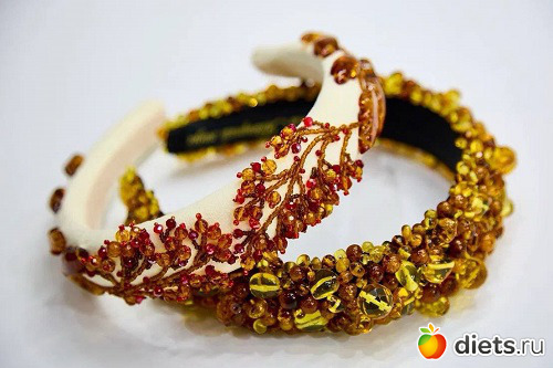 Зимние кокошники и варежки также украшали балтийским камнем возрастом более 40 миллионов лет. Коллекция пополнится кафтанами, сарафанами, телогрейками и косоворотками. Всего используют пять килограммов янтаря.