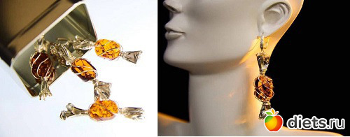 А это вообще нечто невообразимое - Серьги "Леденцы" и подвеска из янтаря. Украшения создали в одном экземпляре при помощи нейросети. Для каждой серёжки и подвески использовали по три грамма янтаря. Сходства с леденцами ювелиры комбината достигли благодаря лузгованию — специальной обработке камня в автоклаве. Обёртку для леденцов выполнили из серебра. Она также служит каркасом украшений.
