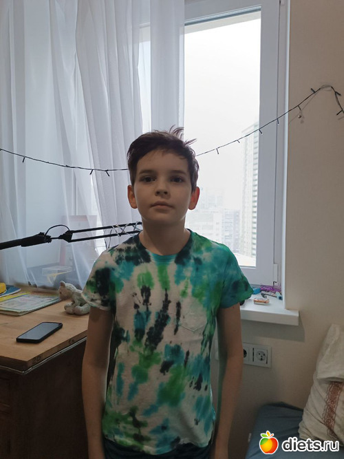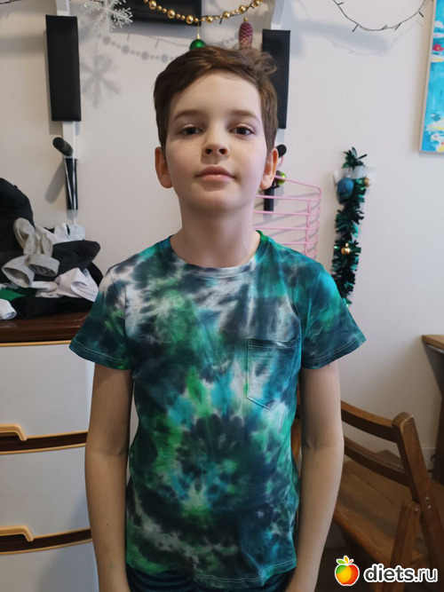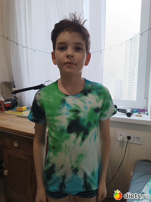 А сейчас хвастаться буду. Не собой, Гришей. Ему подарили в школе на день рождения набор для окраски тканей. Специально купили три белые футболки и Гриша два дня их окрашивал строго по инструкции