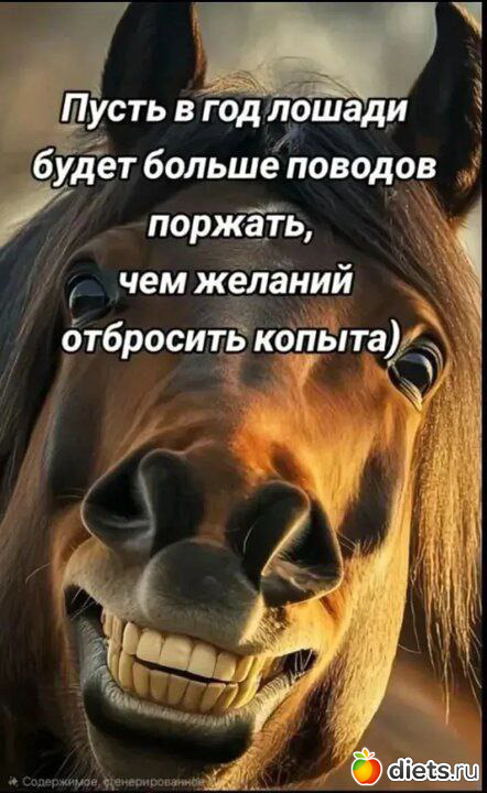 А вообще… пусть все идет своим чередом - жизнь мудрее нас. Давайте дружно проскачем в этом году на этом коне, но чтобы ни изб тебе горящих, ни бесхозных коней. От всего сердца желаю, чтобы ваша Лошадка скакала в правильном направлении!
