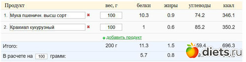 Теперь по составу самого блина. Крахмал кукурузный у меня не в почете. почему то считают что это ПП-шный продукт, но даже обычная мука высшего сорта смотрится выгоднее чем крахмал: