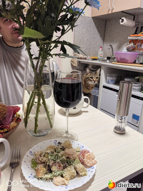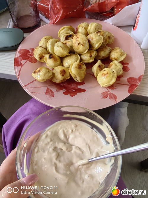 В кофе мне муж воды пожалел, получилась полкружки. Поэтому я могла сливок добавить несколько больше обычного (их давно уже не взвешиваю, на привычном объёме кофе и кружке всегда плюс-мирус 5г) Картошку понятное дело невозможно посчитать, на пельмени и салат уже просто не стала заморачиваться, выбрала из предложенных вариантов.