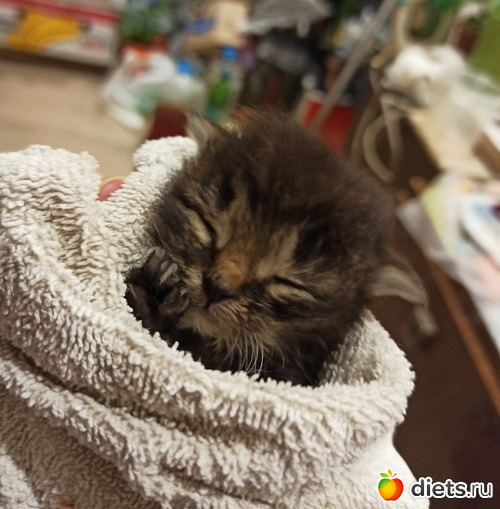 Уличная кошка по имени Монро решила перепрятать своих котят, да одного потеряла в нашем саду. С обеда он плакал, но мы ждали, что она вернется, найдет и заберет ребенка. В девятом часу вечера поняли, что не придет, а ночи в мае были очень холодными. Пошли искать. Он и правда, вряд ли пережил бы. Лежал и изредка попискивал. Принесли, рассмотрели. Глазки только начали проклевываться, совсем крохотный. Кормили из шприца, благо, уже имелся опыт. Днем заворачивала в салфетку и ставила столбиком в карман. Так и росли.