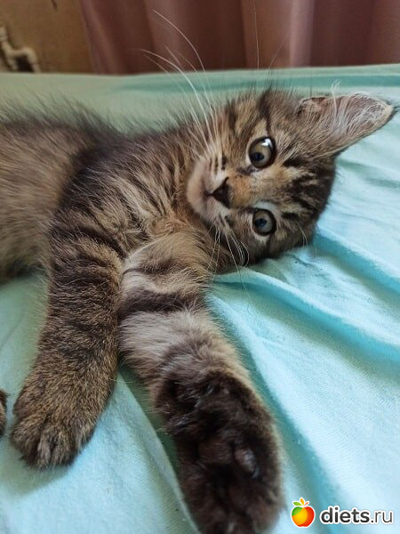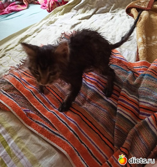 Уличная кошка по имени Монро решила перепрятать своих котят, да одного потеряла в нашем саду. С обеда он плакал, но мы ждали, что она вернется, найдет и заберет ребенка. В девятом часу вечера поняли, что не придет, а ночи в мае были очень холодными. Пошли искать. Он и правда, вряд ли пережил бы. Лежал и изредка попискивал. Принесли, рассмотрели. Глазки только начали проклевываться, совсем крохотный. Кормили из шприца, благо, уже имелся опыт. Днем заворачивала в салфетку и ставила столбиком в карман. Так и росли.