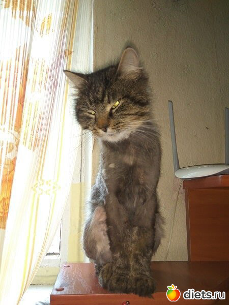 А здесь наш мальчик после близкого знакомства с собакой. Пришлось обрить, и правильно сделали. Ветеринар нашла еще несколько ранок, мы из-за шерсти не увидели. Но пол-попы наш мальчик потерял. Удивительно, что попа заросла быстро, а вот шерсть восстанавливалась долго-долго...
