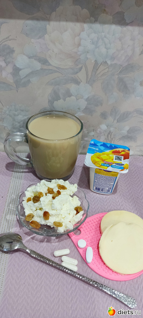 Завтрак. Творог+ изюм+йогурт. Кофе с молоком. Сулугуни. Витаминки.