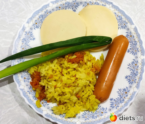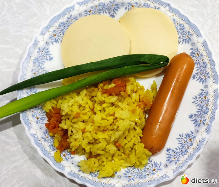 Ужин для себя делать поленилась. Поэтому пару ложек плова, сулугуни, сосиска, лук.